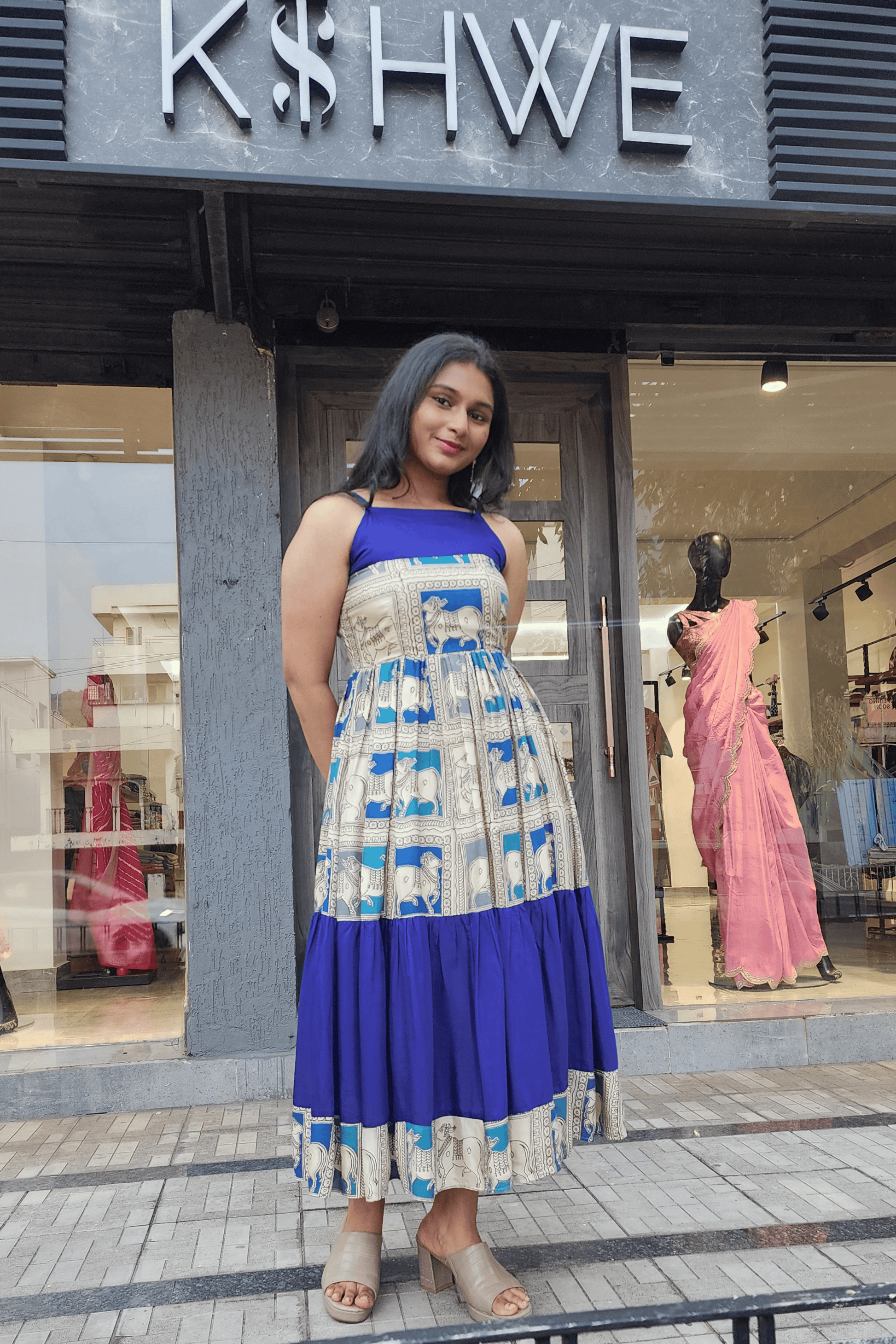 A colorful, festive Kalamkari Pichwai print dress that celebrates Indian art through vibrant hues and flowy comfort — perfect for special gatherings or statement everyday wear.